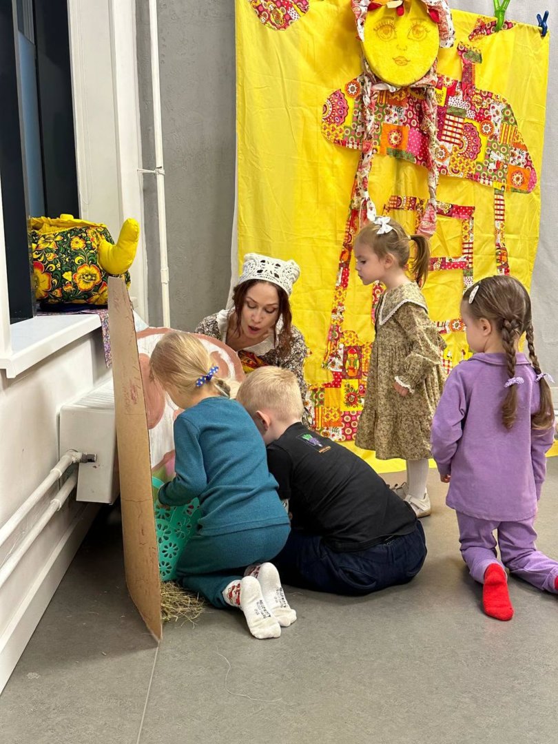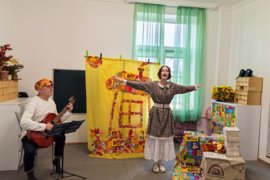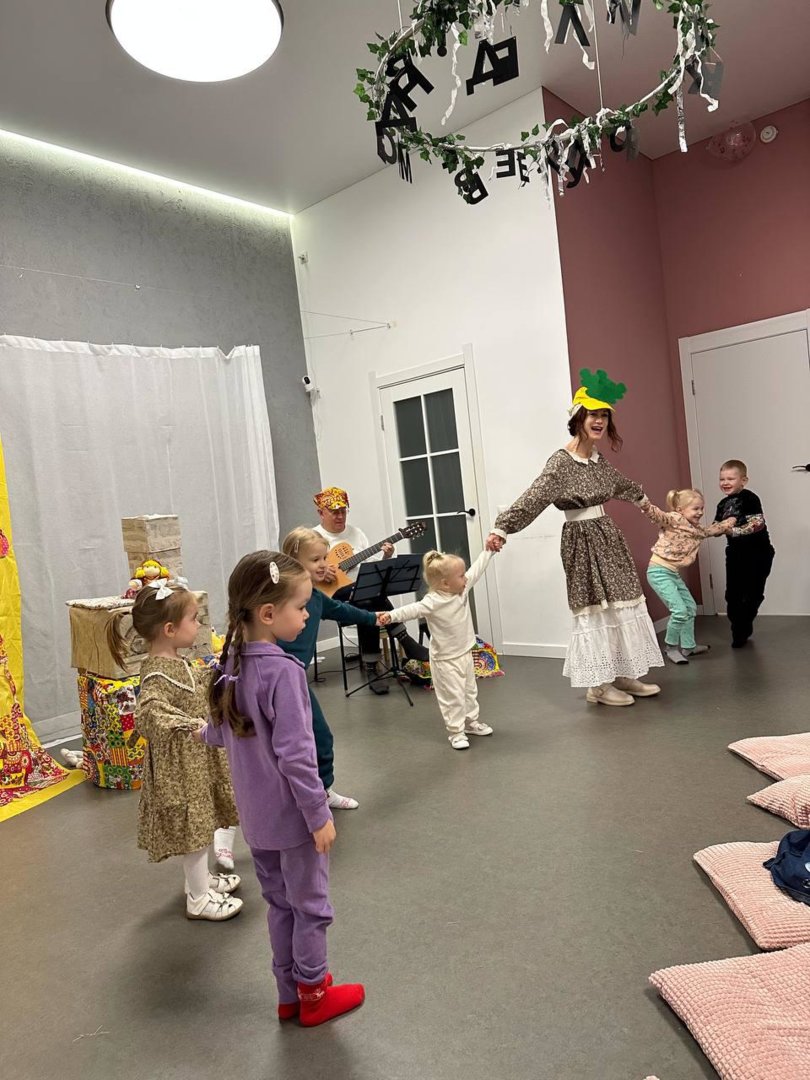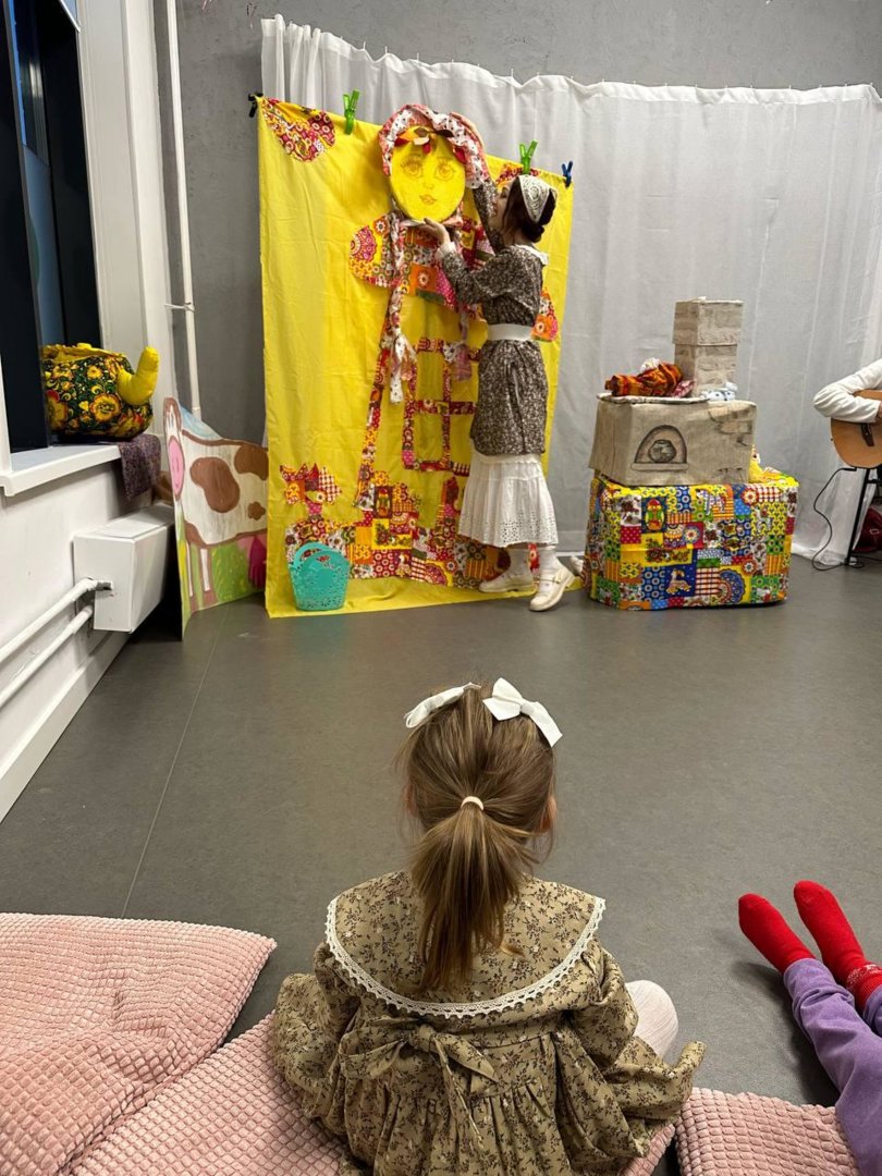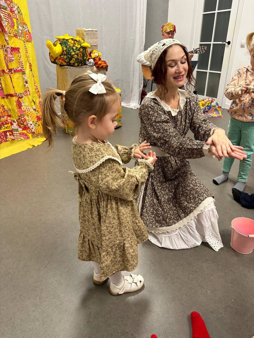 В спектакль органично вплетены сюжеты русских народных сказок,и всё представление сопровождается чудесными русскими народными песнями, играми и хороводами.